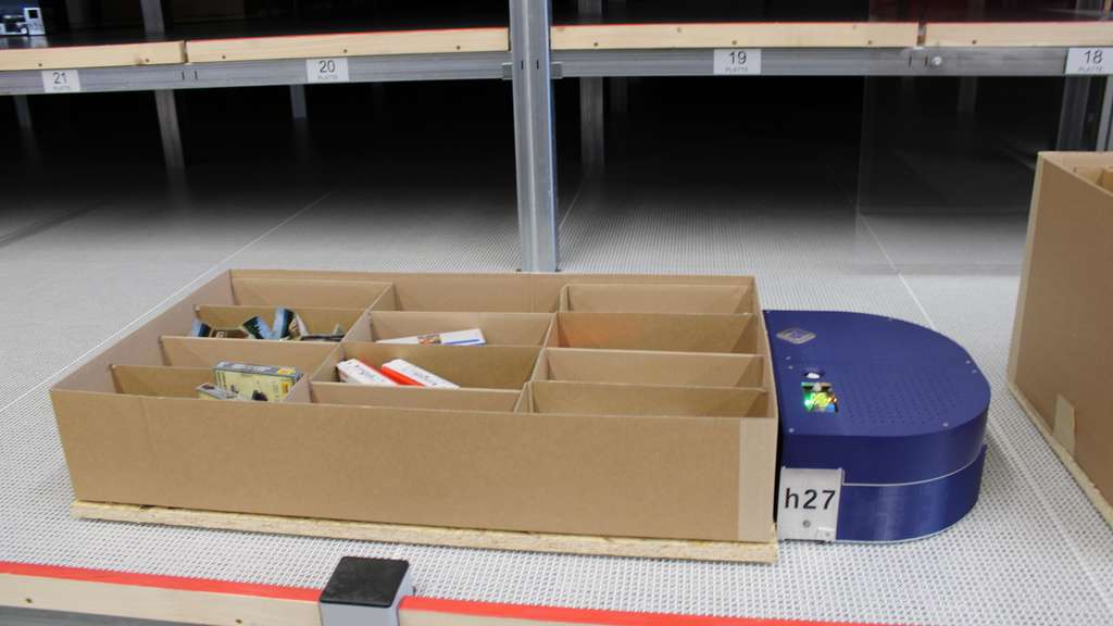 Die sechs Meter hohe Konstruktion aus Holz und Stahl hat eine Grundfläche von 700 Quadratmetern, doch mit ihren zwölf Ebenen bietet sie 3.000 Quadratmeter Platz für insgesamt 50.000 Lagerfächer. Hier bewegen sich KI-gesteuert mehr als 100 Roboter und transportieren Warenträger, die sie wie kleine, ferngesteuerte Gabelstapler an verschiedene Stationen bringen, wo sie dann von den Mitarbeitern für den Versand bestückt werden.