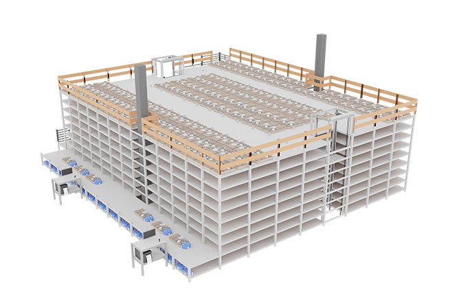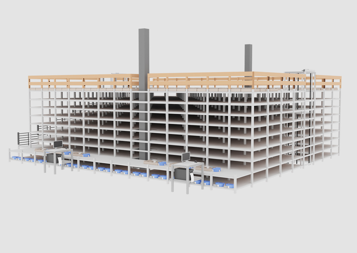 Ein entscheidender Vorteil des Systems liegt in den unterschiedlichen Ebenenabständen innerhalb des Lagers. Dies ermöglicht es, den verfügbaren Raum optimal zu nutzen, da für flachere Produkte weniger Platz benötigt wird, während voluminösere Artikel problemlos in höheren Ebenen untergebracht werden können. In Kombination mit den anpassbaren Warenträgergrößen wird eine maximale Flexibilität gewährleistet, die für ein Fulfillment-Center mit seinem breiten Produktspektrum unverzichtbar ist.